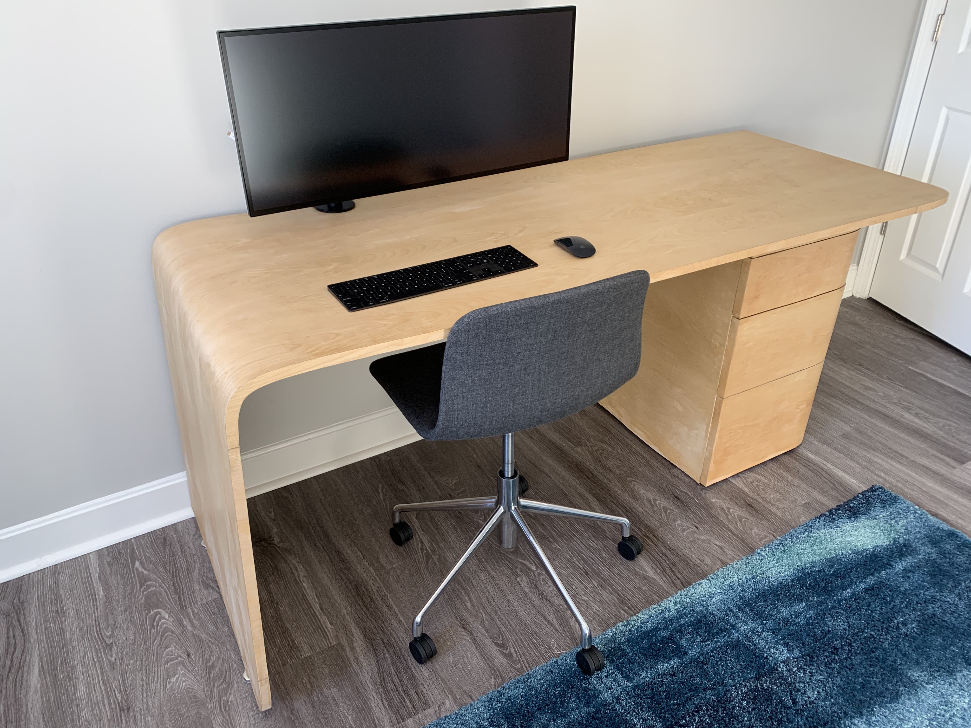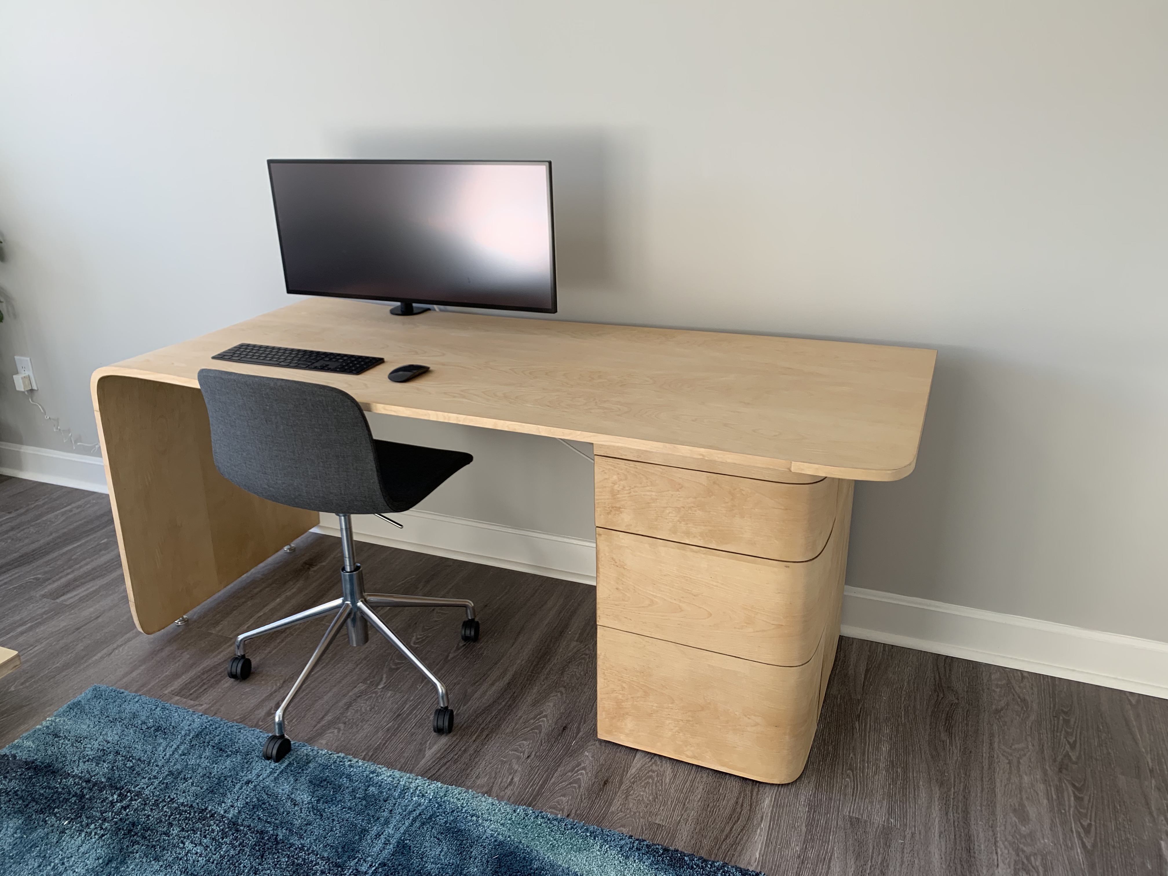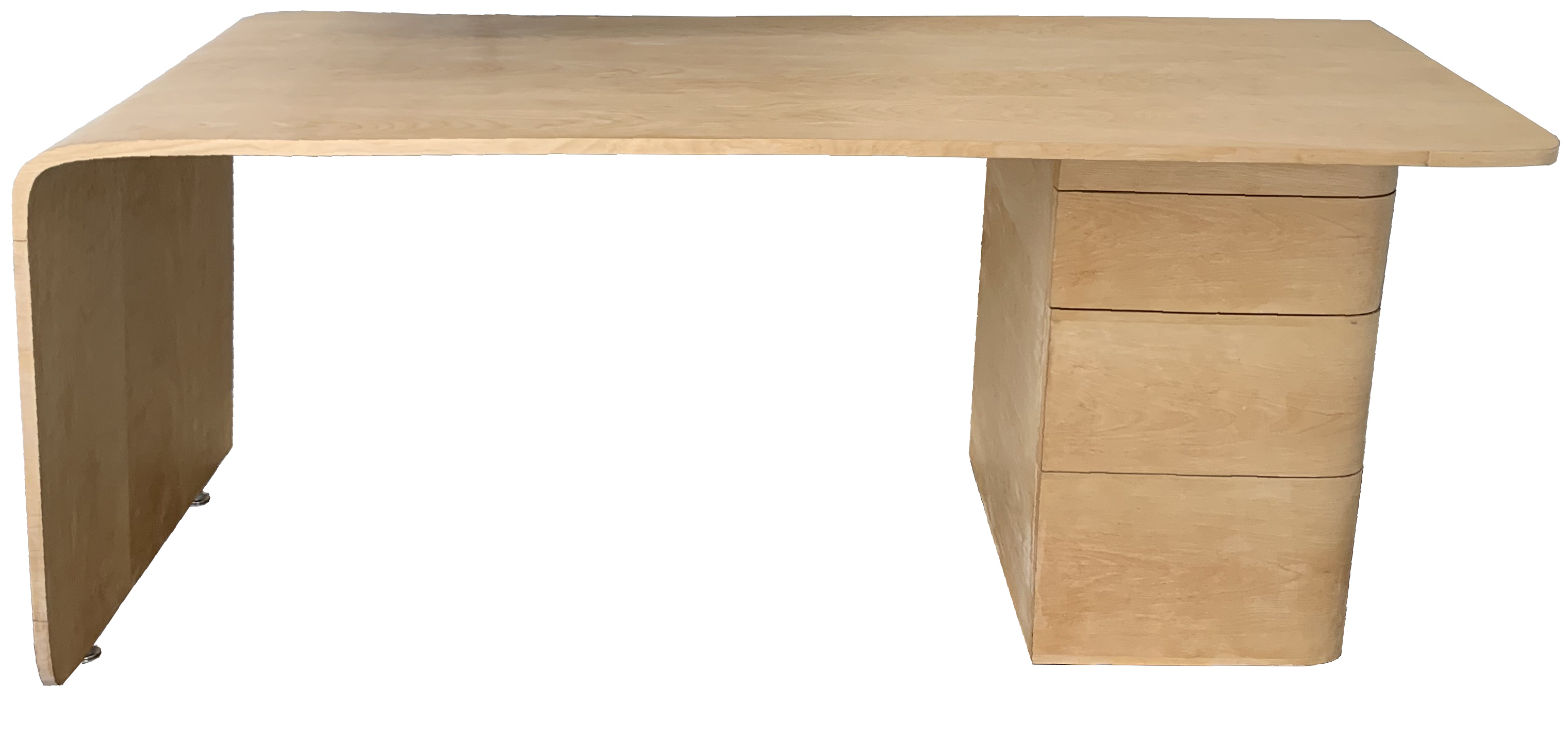 As usual, these design choices were simple on paper; however, in reality they created tremendous construction challenges. The most challenging element was the curve of the top surface as it dropped down to become a leg of the desk. Wood does not naturally bend into such a shape, and the leg had to be structurally supportive. I achieved the shape and the strength of this curve by cutting the profile of the curve out of three quarter inch plywood on a CNC machine. I made about forty curve shapes and then laminated them together. This curve was then joined to two ordinary sheets of plywood to create the main piece of the desk. Finally, I wrapped the desk in a real birch veneer to simulate the look and feel of solid wood. This veneer work posed its own challenges. The veneer must be bonded to the plywood with an industrial contact cement. There was no room for error because once the veneer and the wood touch, they are permanently bonded. I used a technique used for laminate counter tops where the veneer is suspended above the piece on dowels. The dowels were removed one at a time to allow control over the bond process.