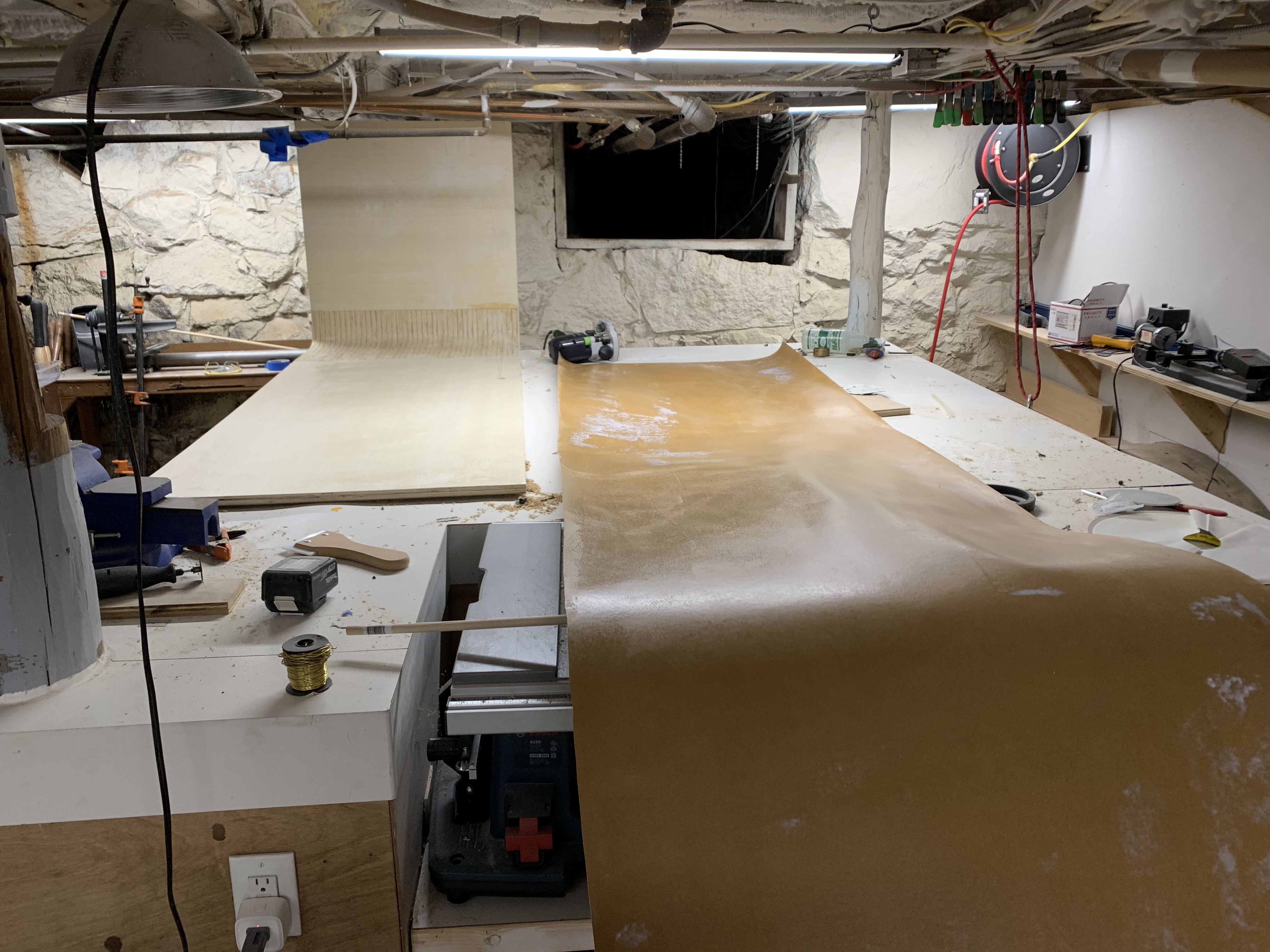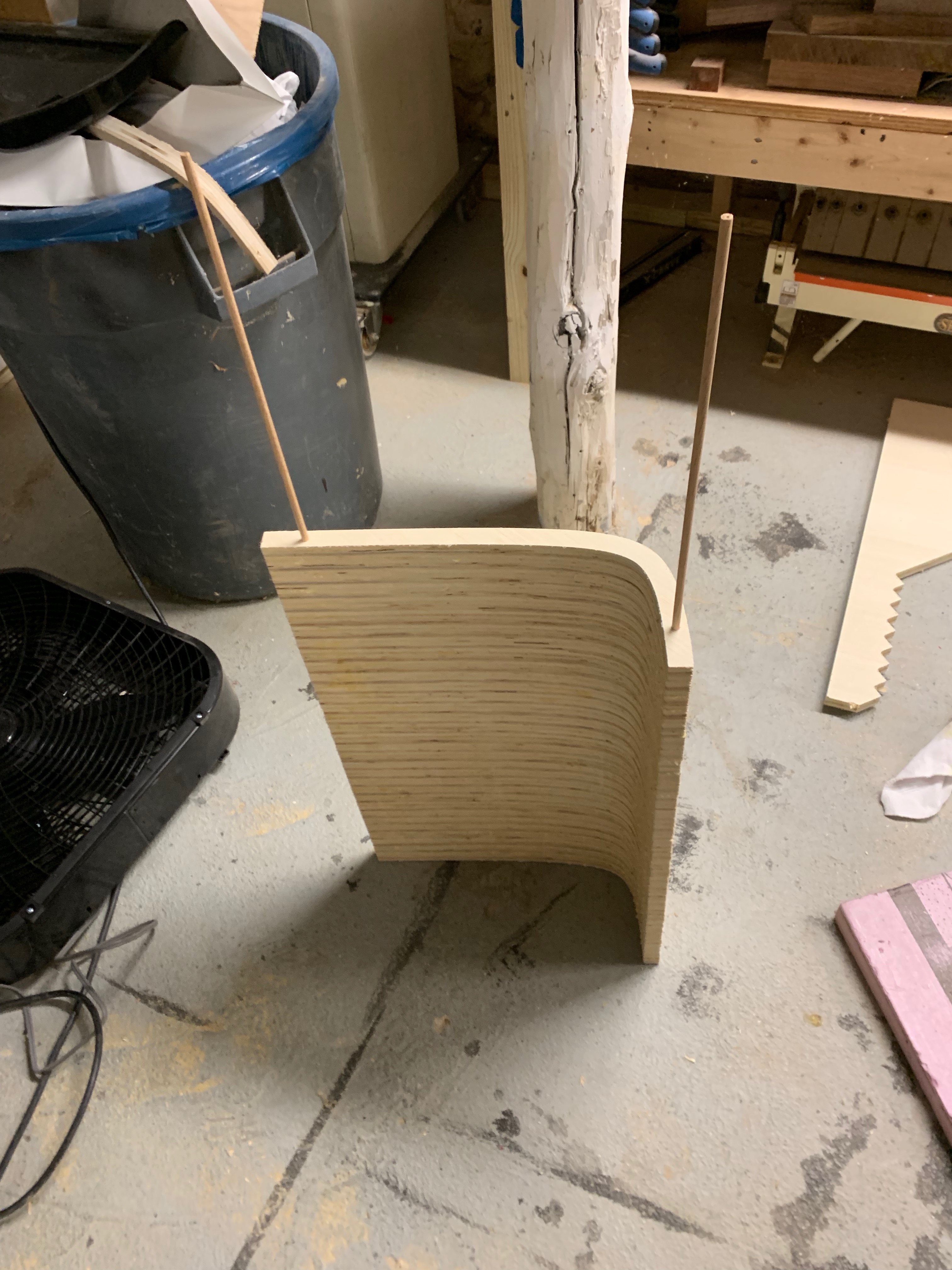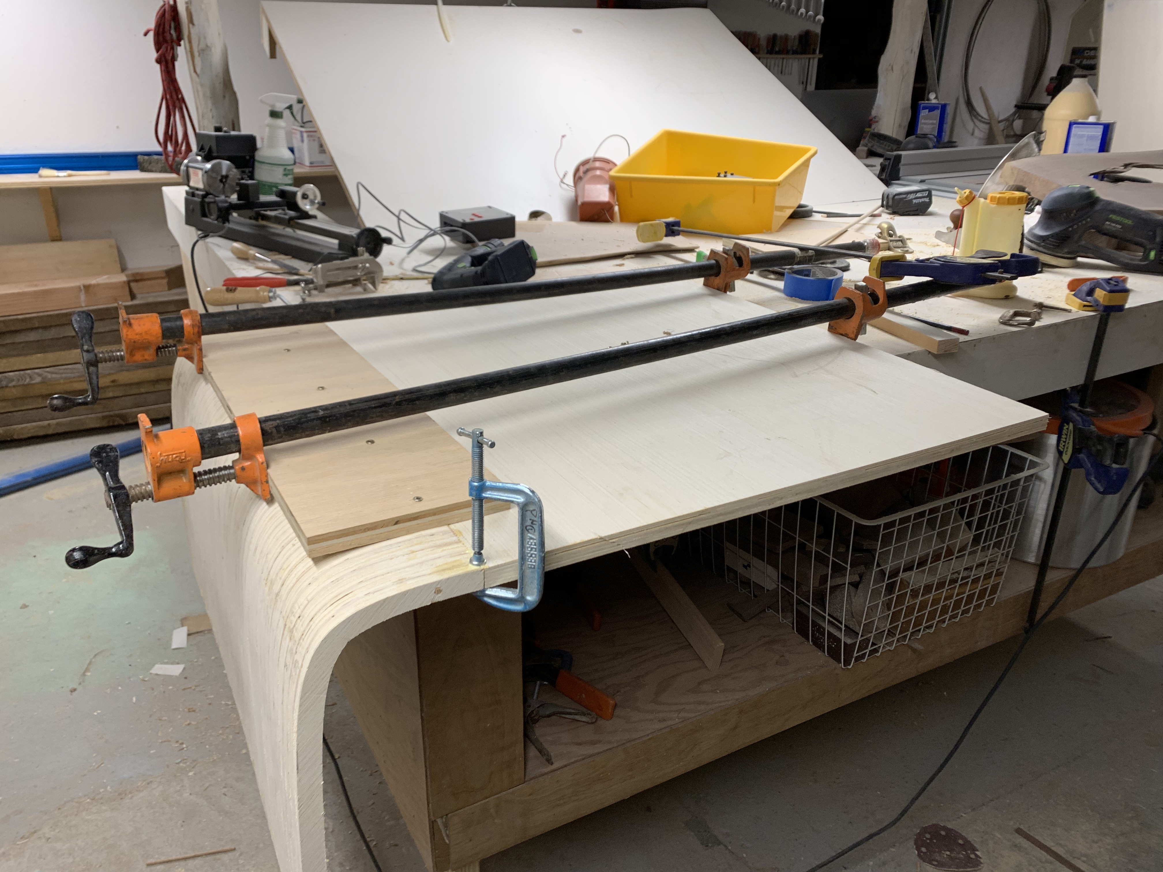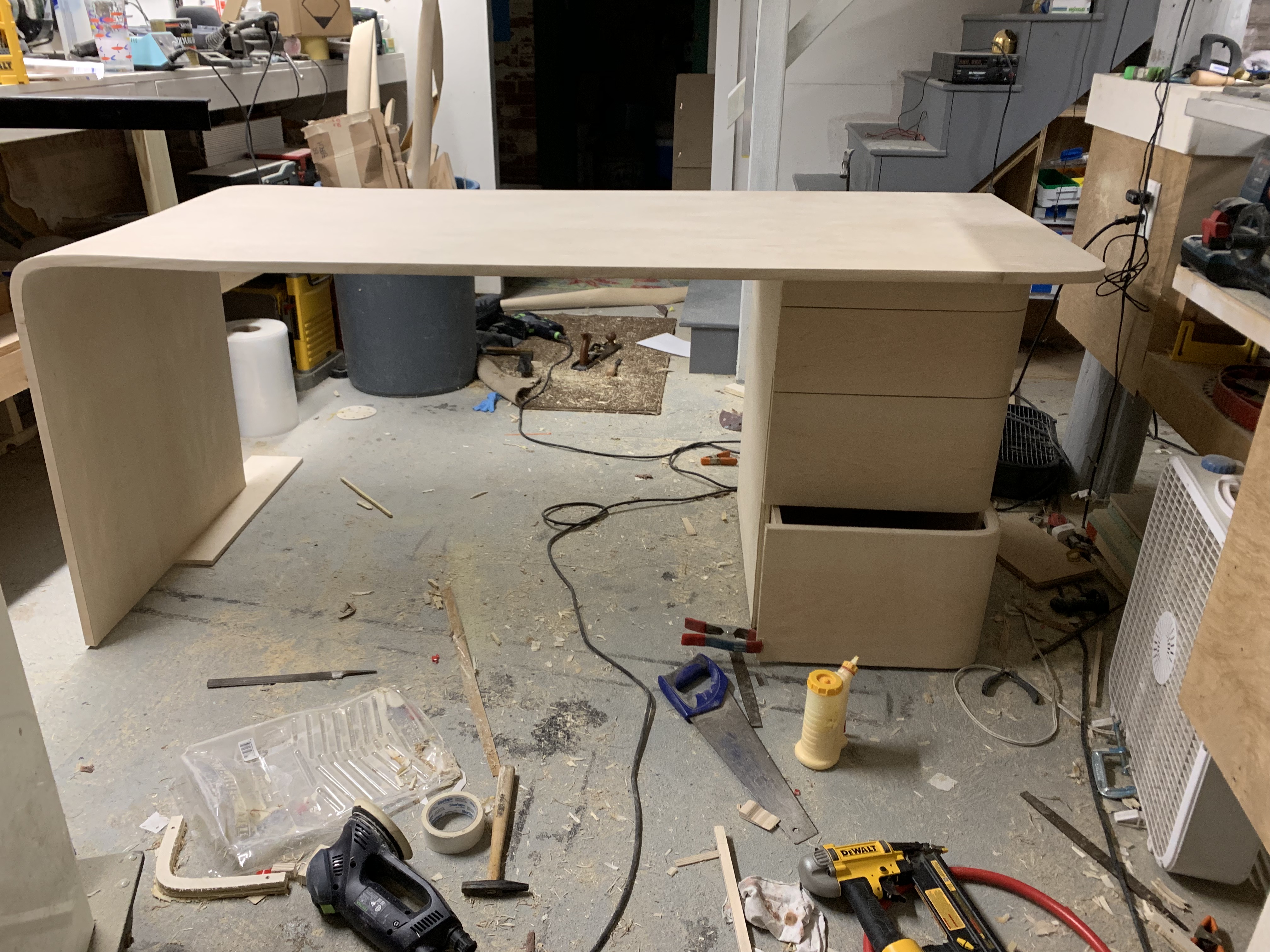 As usual, these design choices were simple on paper; however, in reality they created tremendous construction challenges. The most challenging element was the curve of the top surface as it dropped down to become a leg of the desk. Wood does not naturally bend into such a shape, and the leg had to be structurally supportive. I achieved the shape and the strength of this curve by cutting the profile of the curve out of three quarter inch plywood on a CNC machine. I made about forty curve shapes and then laminated them together. This curve was then joined to two ordinary sheets of plywood to create the main piece of the desk. Finally, I wrapped the desk in a real birch veneer to simulate the look and feel of solid wood. This veneer work posed its own challenges. The veneer must be bonded to the plywood with an industrial contact cement. There was no room for error because once the veneer and the wood touch, they are permanently bonded. I used a technique used for laminate counter tops where the veneer is suspended above the piece on dowels. The dowels were removed one at a time to allow control over the bond process.