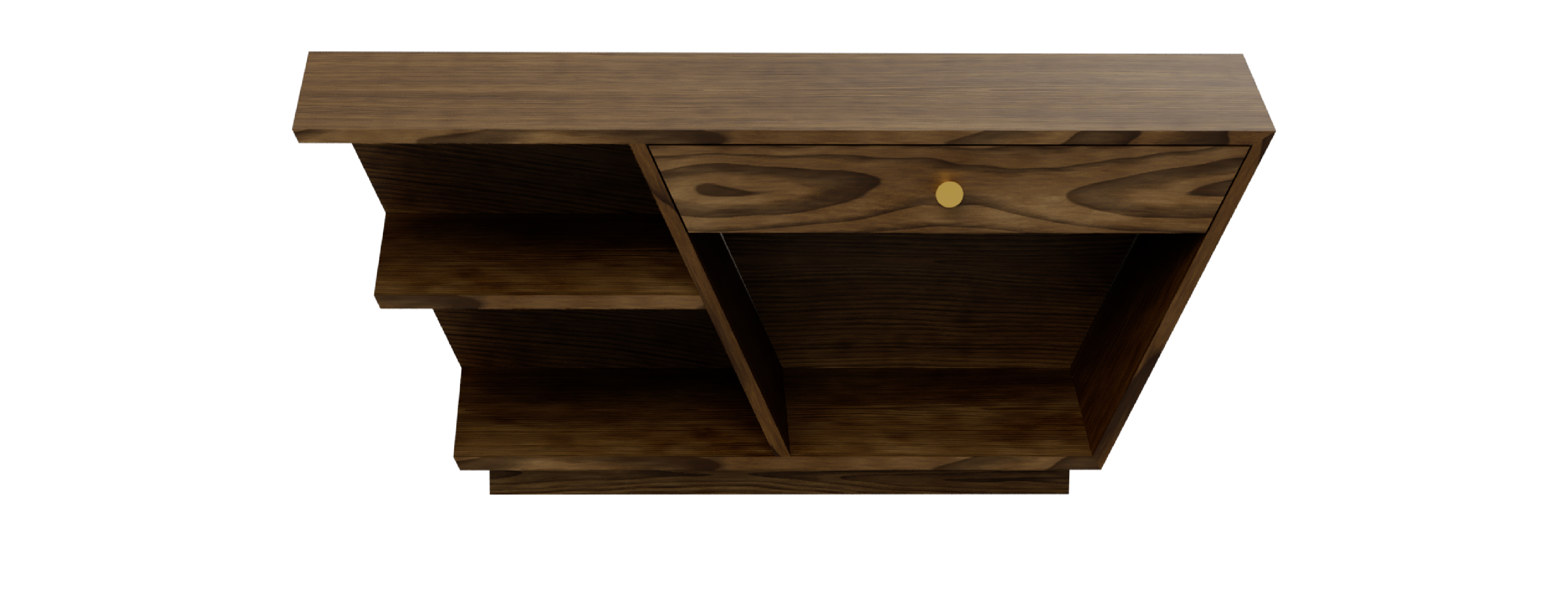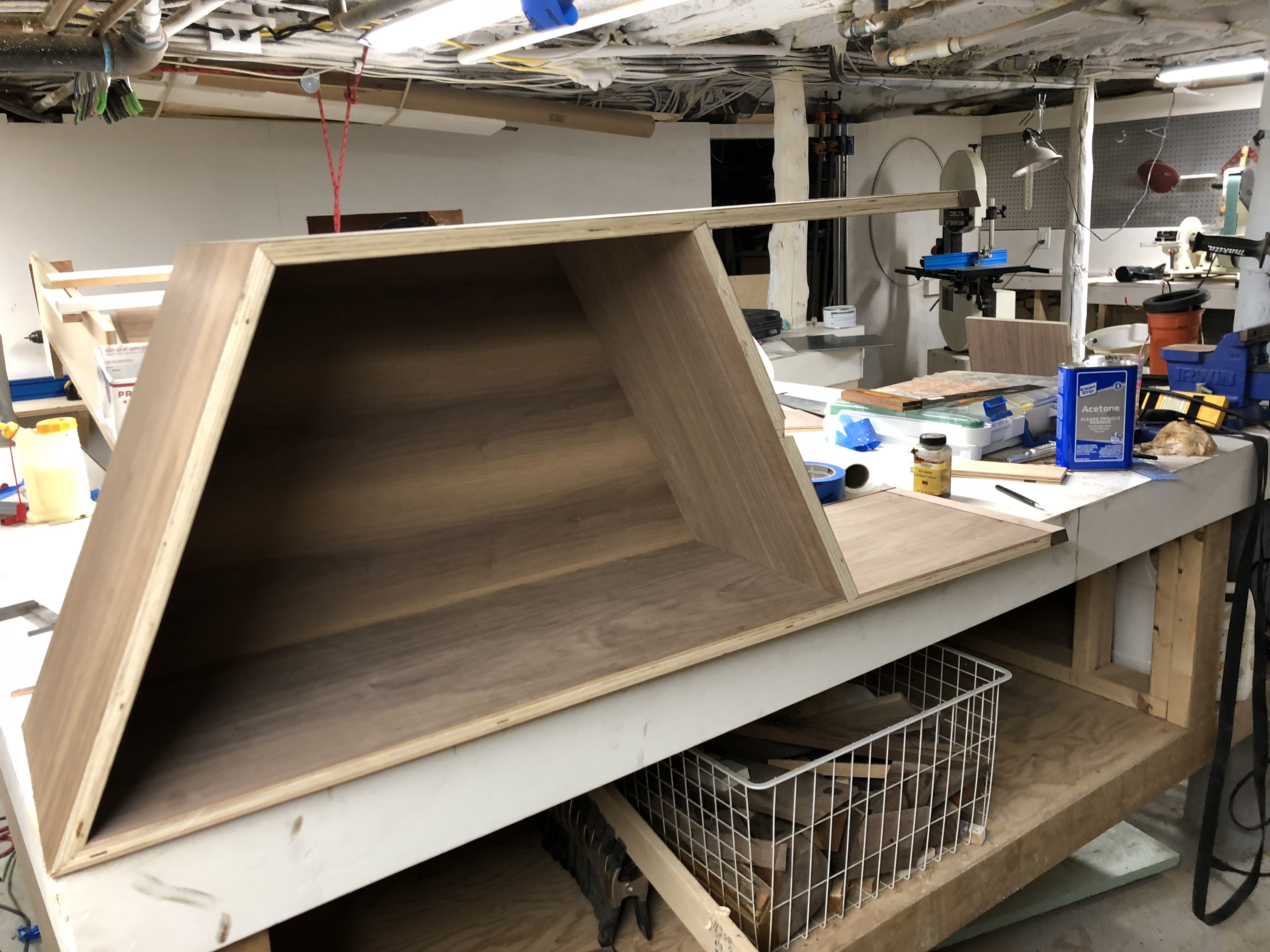 From these models, I began building the piece. It was constructed of walnut veneered plywood and finished with a face frame that covers the raw edges. The most technically difficult aspects of this construction were the multiple angle cuts (or miters) required to achieve the trapezoid shape. Many of these cuts took multiple attempts.