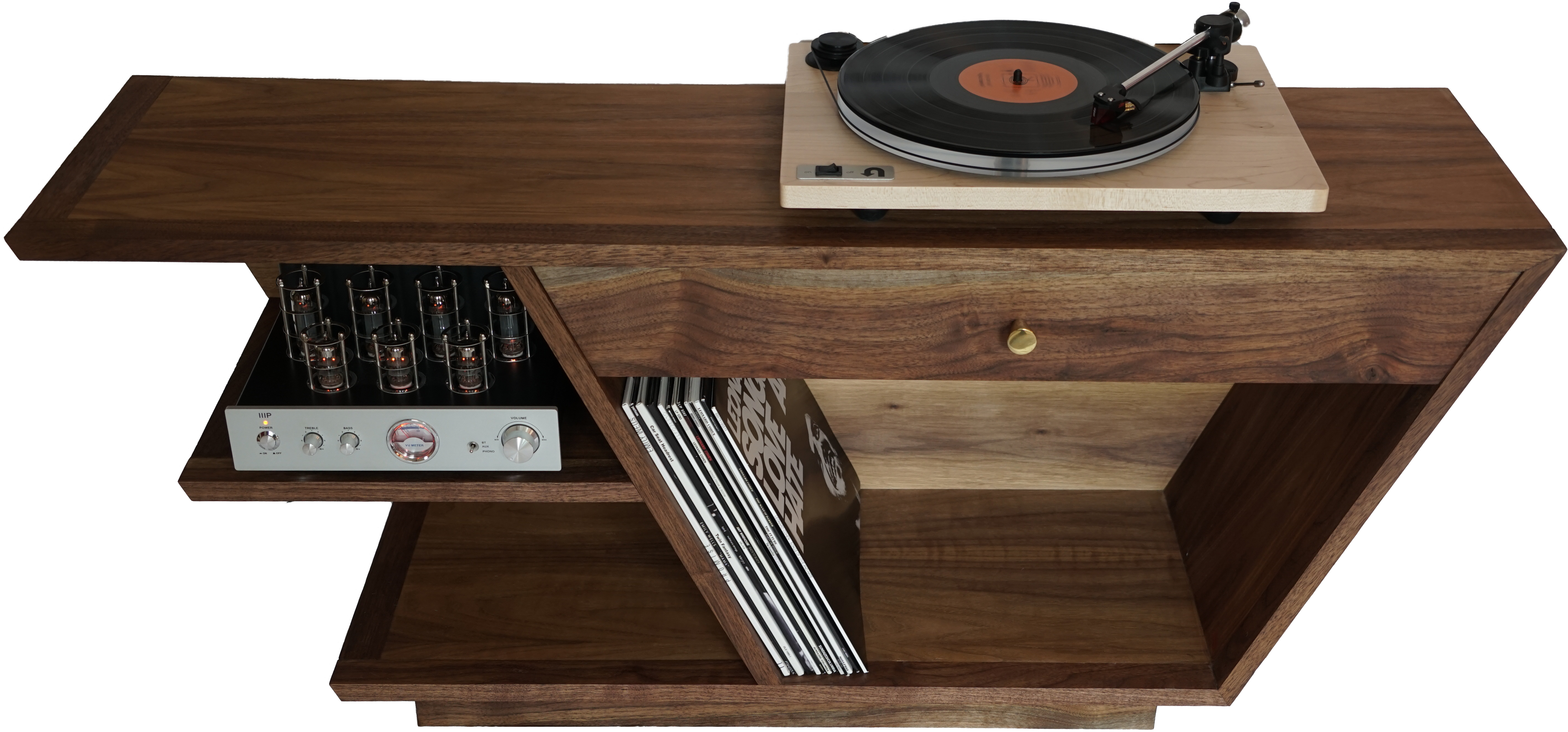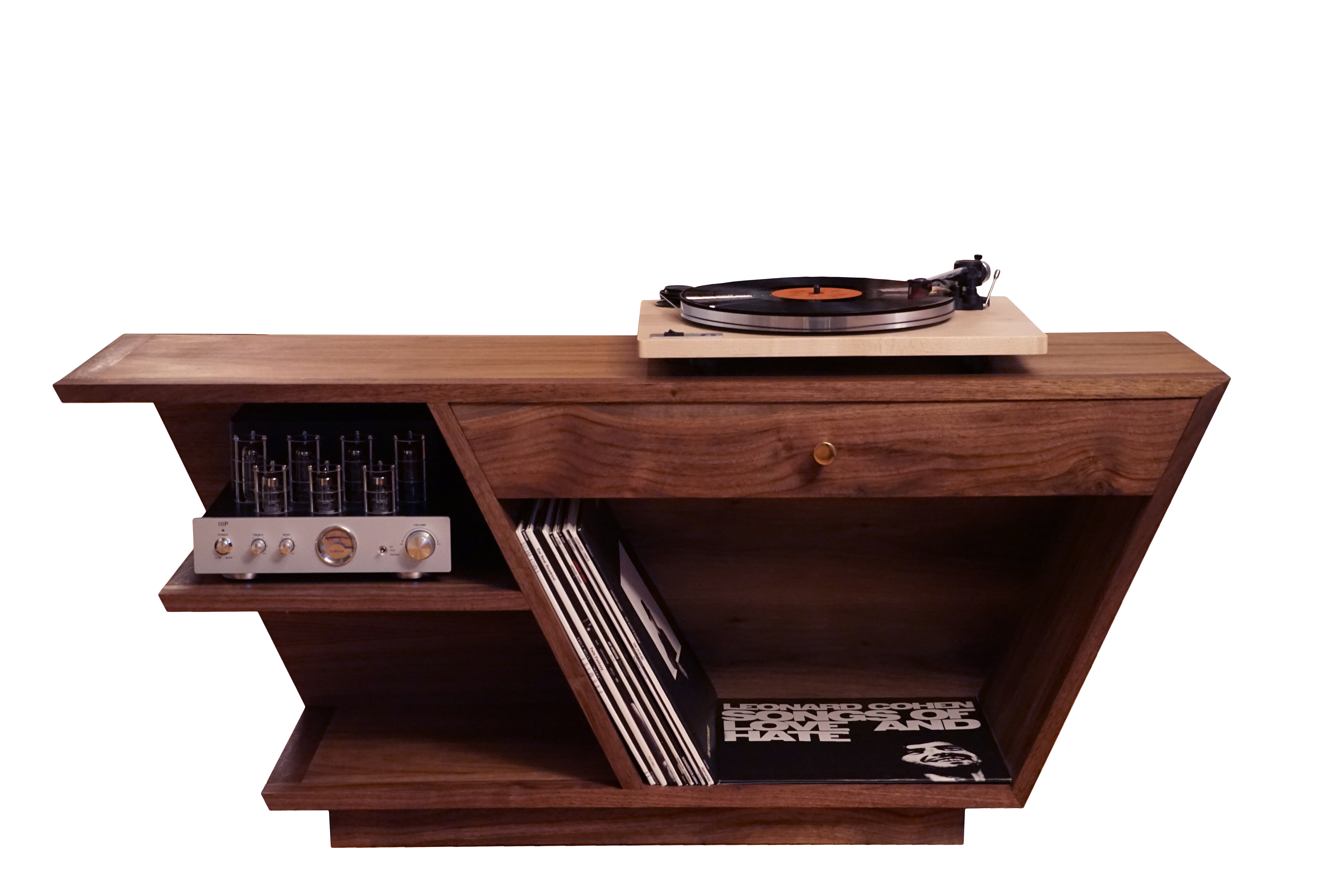 I built this record cabinet as an exercise in mid-century design. In both design and construction, it is one of my most complex projects. I began by choosing a record player and amplifier as I wanted the equipment and the cabinet to read as one cohesive unit. The form of the lower part of the cabinet was inspired by the way records naturally lay at an angle when stacked in a bin. This will encourage the user to leaf thorough the stack. After four separate CAD models, I settled on the proportions. Because of the intricate joinery, I created yet another model in which every cut, angle, and dimension was calculated.