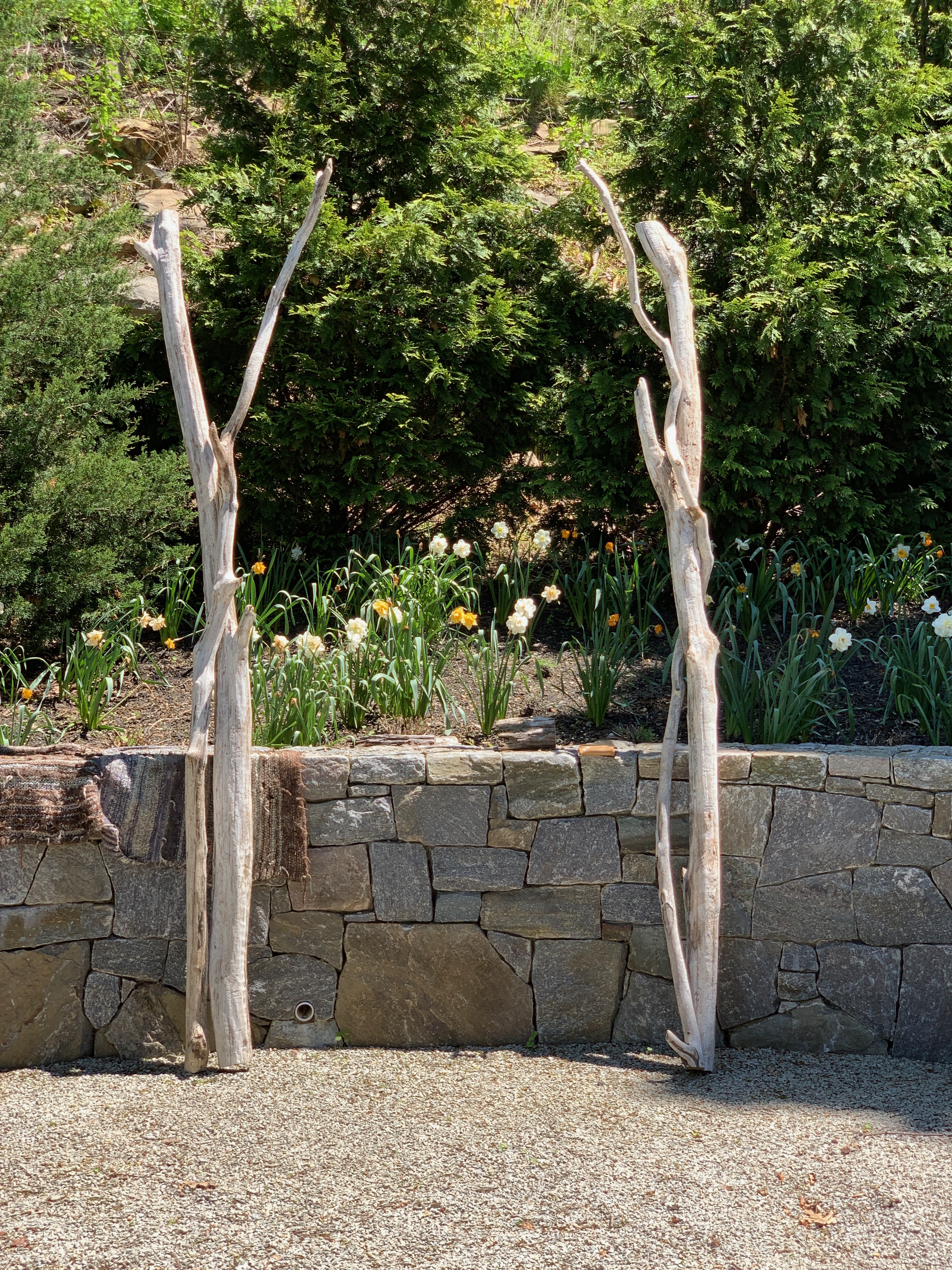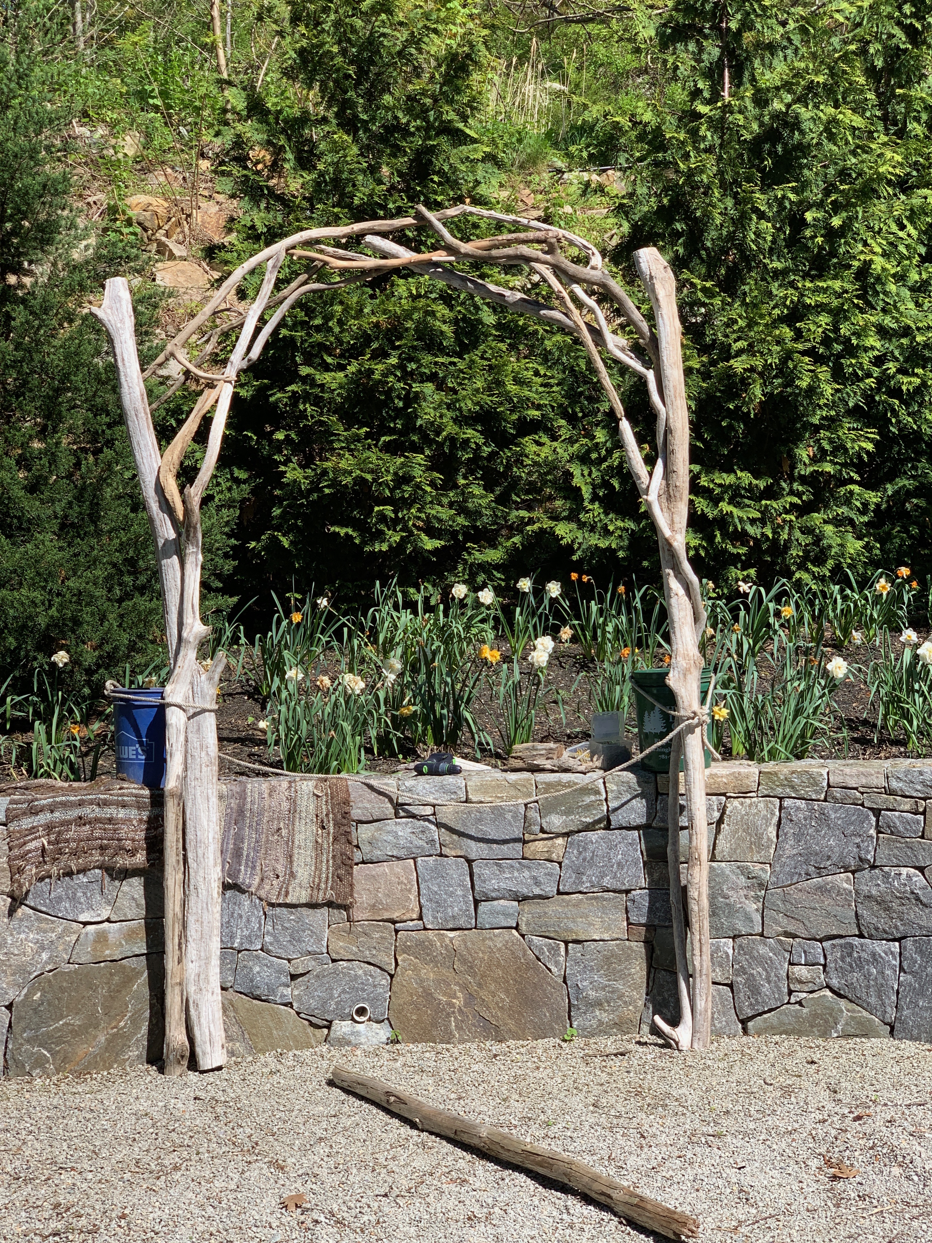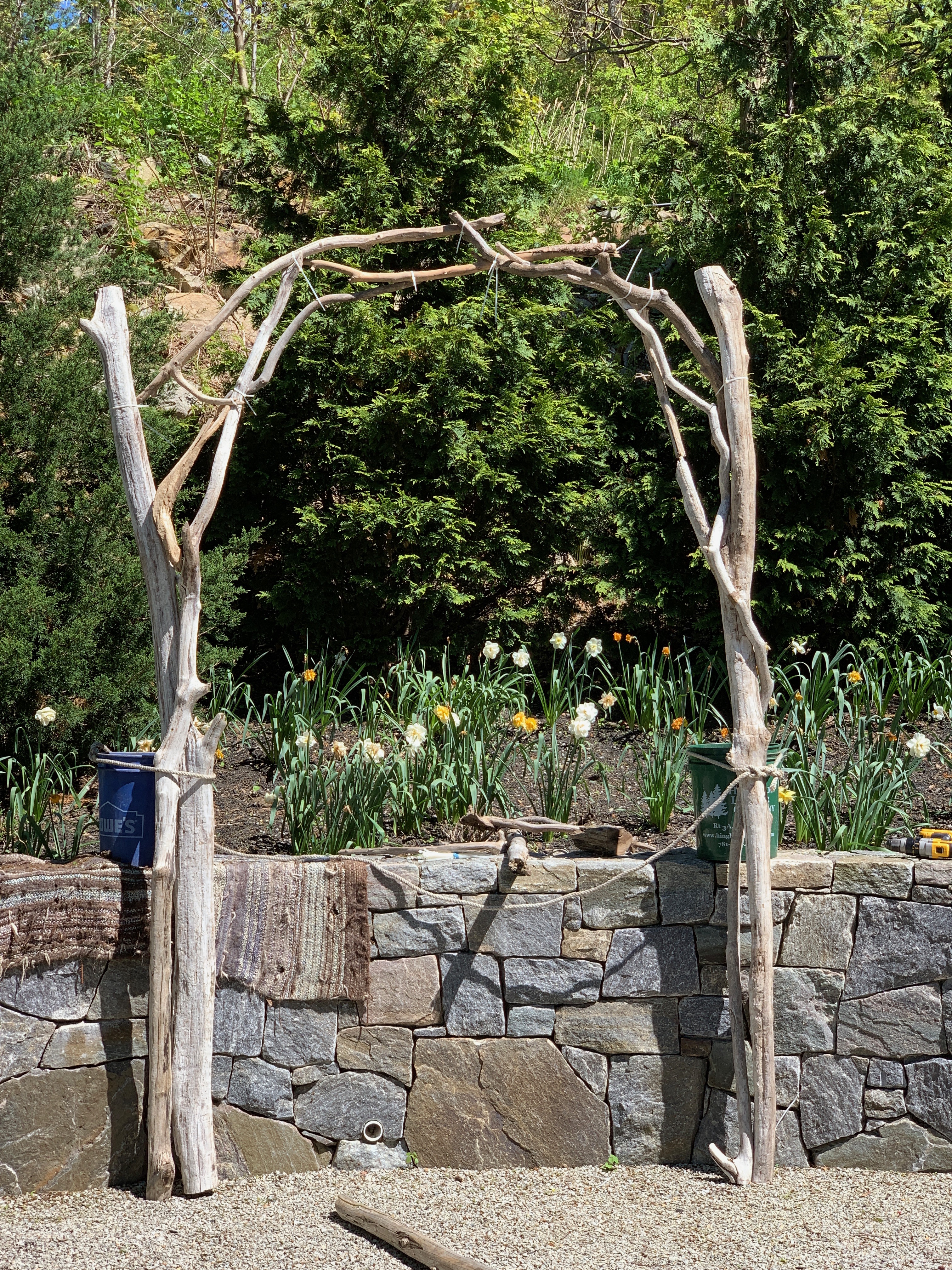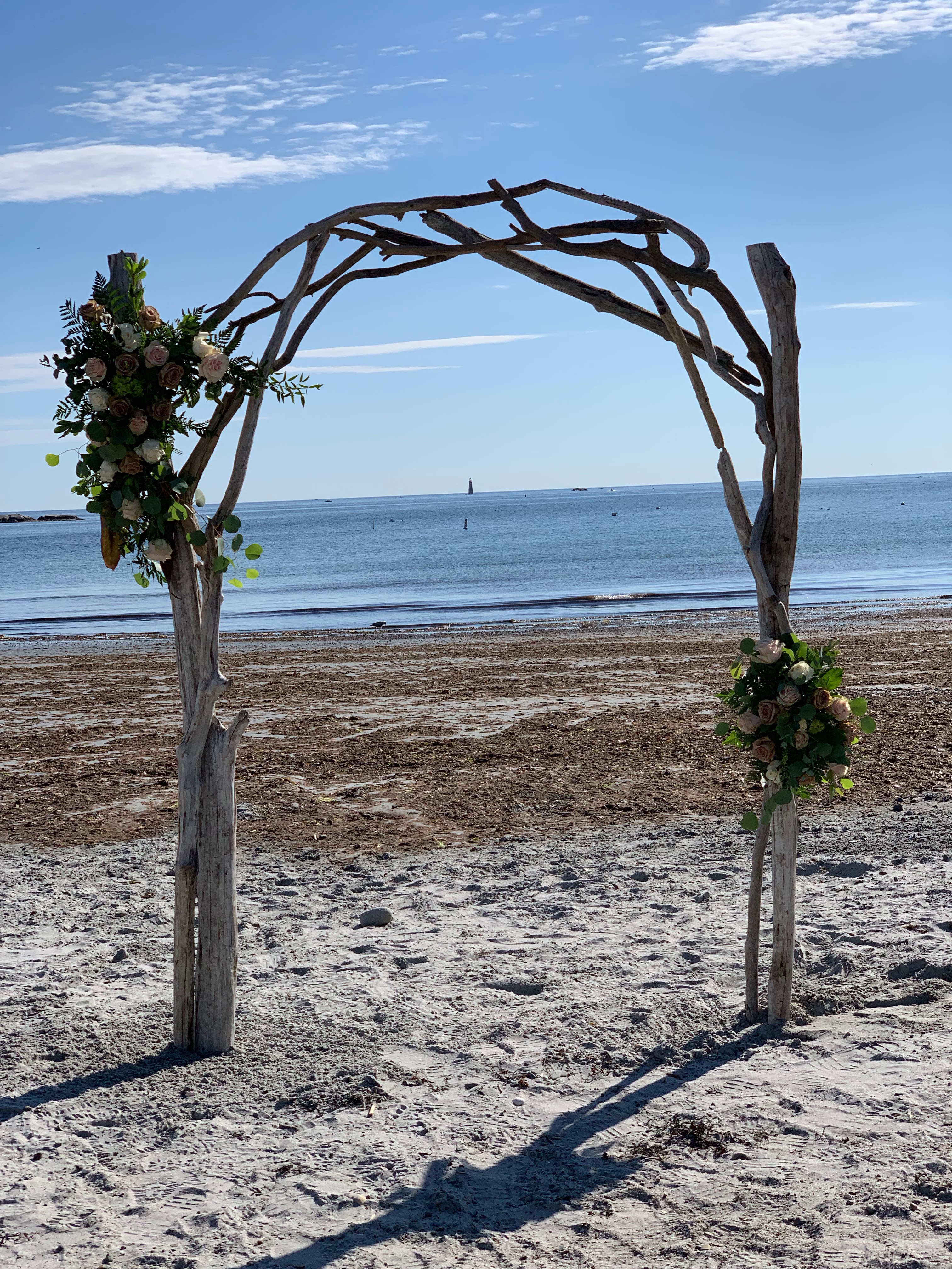 I built this arch for a 2018 summer wedding. Over the course of the year leading up to the wedding, I periodically combed the beach on which the wedding would be held. In fact, the vast majority of the drift wood used in the arch came from the same beach. The design of this piece was free form. The organic shapes did not lend themselves to my usual CAD planning. I started by selecting the sturdiest pieces to be the two uprights. Once these were in place, I zip-tied the upper arch in place. I then zip-tied smaller pieces into place as I fine tuned the visual weight at the top and the curved transitions from the horizontal to the vertical supports. The zip-tying allowed me to make minor adjustments as I built the arch. Later, I replaced the zip-ties with screws.